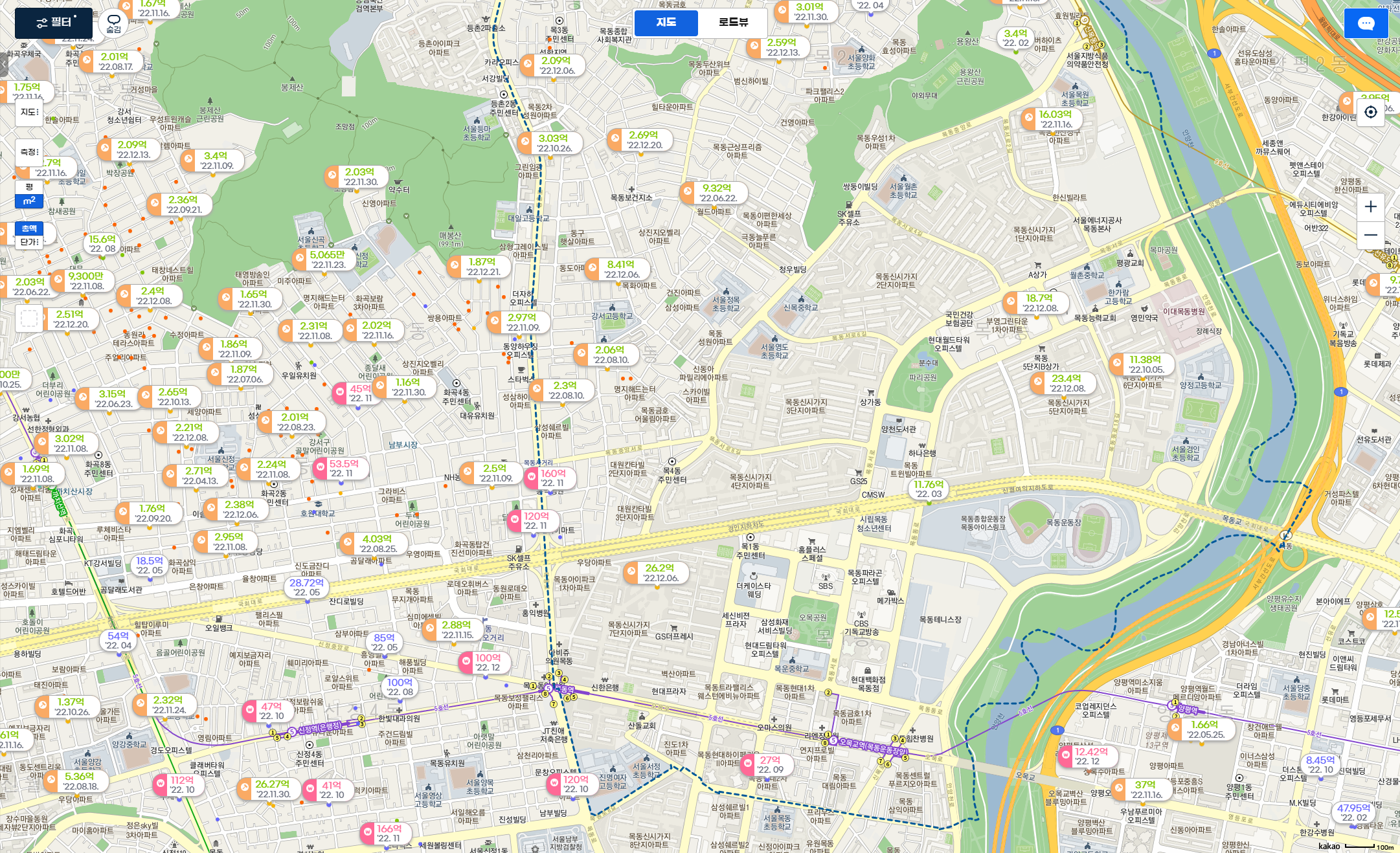 핑크색으로 색칠되어 있는 것은 매물, 파랑색으로 표시되어 있는 것은 매매 사례입니다.