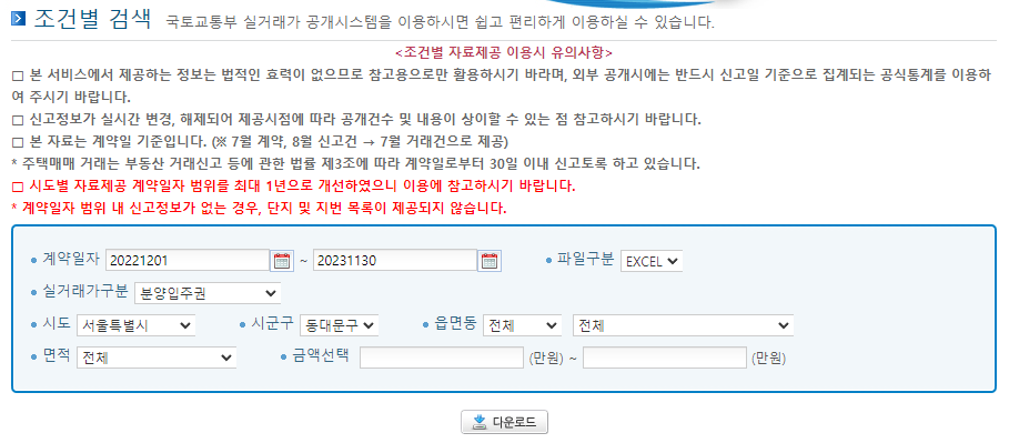 실거래가 자료제공 탭을 클릭하신 후 조건을 입력하고 엑셀을 다운로드 하시면 됩니다.