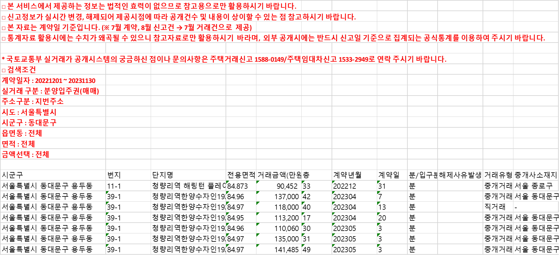 시군구, 번지, 단지명, 전용면적(㎡), 거래금액(만원 단위), 층, 계약년월, 계약일, 해제사유, 거래유형, 중개사소재지 등 다양한 정보가 나오니 참고하셔서 현재 분양권 거래가 어떤지, 과거에 분양권 가격이 어떠하였는지 등을 아실 수 있습니다.