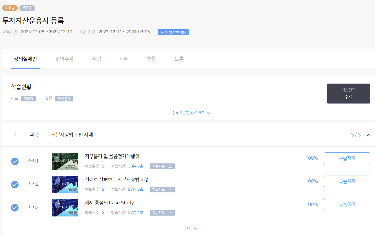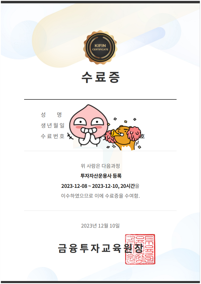 이 수료증을 들고 자산운용전문인력 사전교육 강의를 추후에 들으면 됩니다.