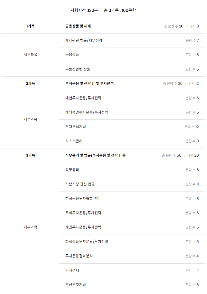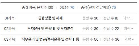 합격 기준은 펀드투자권유대행인, 증권투자권유대행인의 정답 비율 60%과는 달리 투자자산운용사는 합격기준이 70%이다. 즉, 100문제 중 70문제를 맞춰야 하는 시험이다.