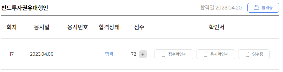 2023년 4월 9일에 시험에 응시를 했고, 약 2주 뒤인 2023년 4월 20일에 펀드투자권유대행인 시험에 합격을 하였다.
